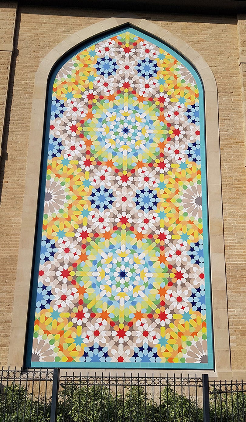 Here’s a giant Moroccan zellige composition I made for a Muslim educational centre in Dewsbury, UK. It’s made of waterjetcut ceramic tiles.