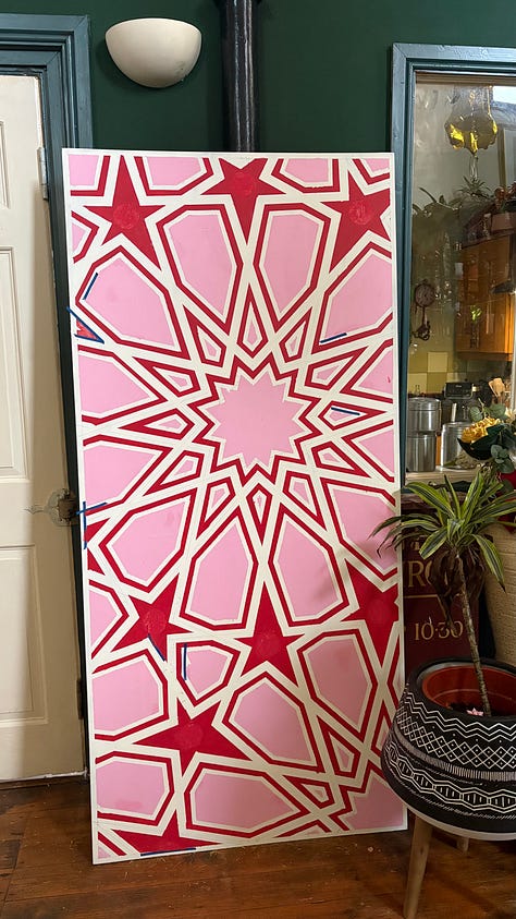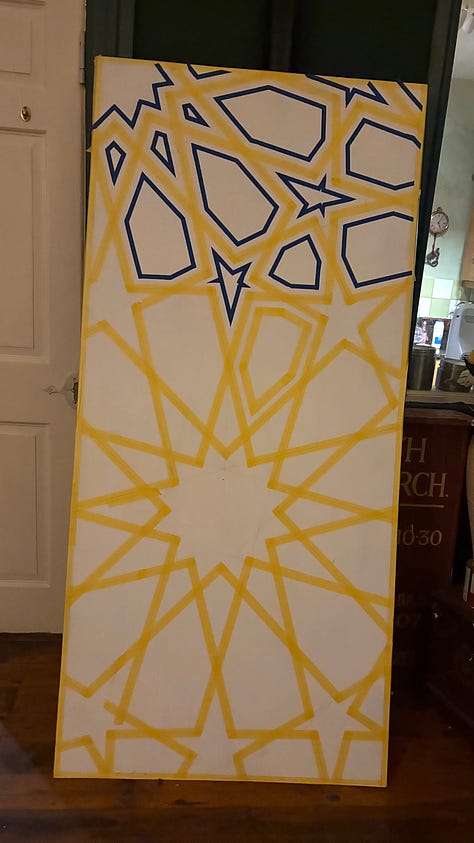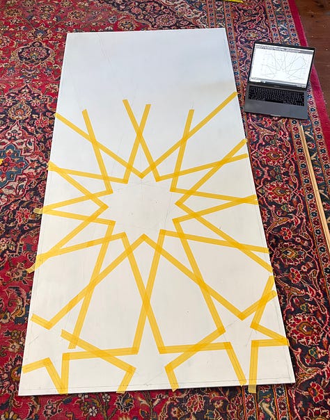 After all the lines were drawn in pencil, I used masking tape to make the pattern appear and more masking tape to identify shapes within the lines.