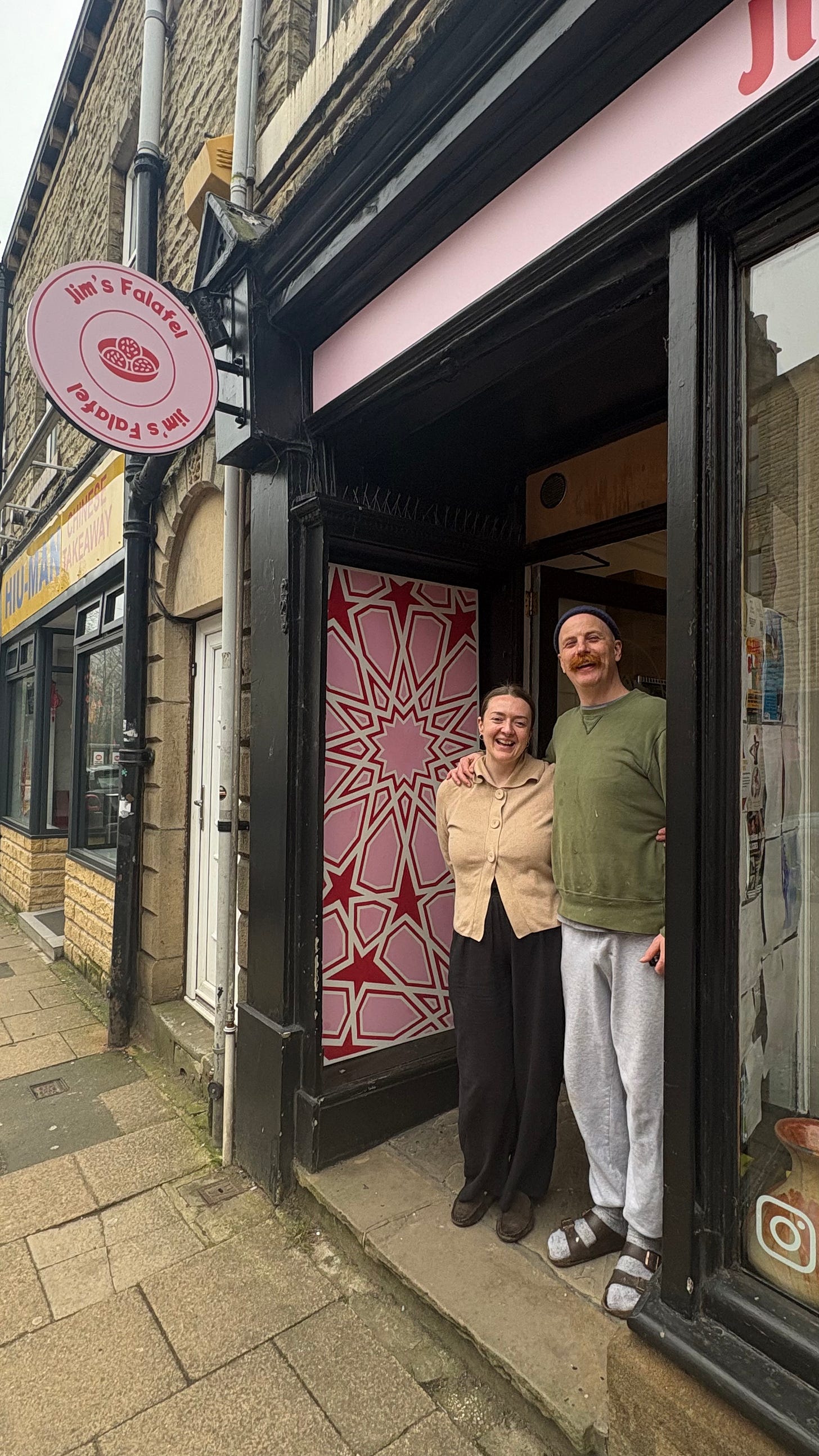 During the pandemic, my wife and I opened a shop in Hebden Bridge: BROUG’s homeware & gifts. In the three years we had this shop, we became part of the shopowners ecosystem in this special town in the Yorkshire hills. One of the many interesting people I met was a guy who made fresh humous on the street for years. He had a small fold-out table, gas stove etc. Recently, he’s finally found a good shop space. As a gesture, I offered to make him a mural next to his shop front door to get maximum attention from passers-by.
